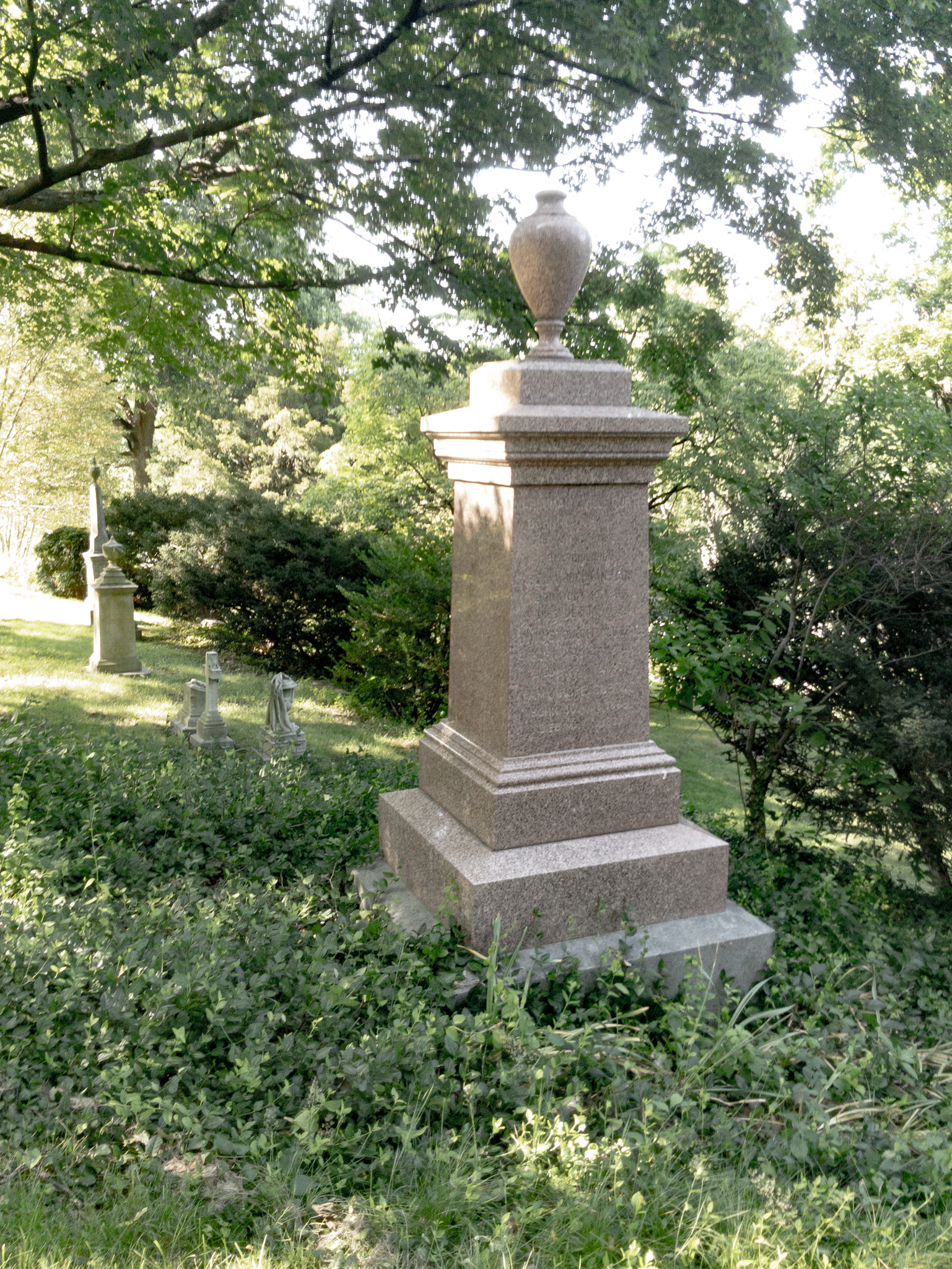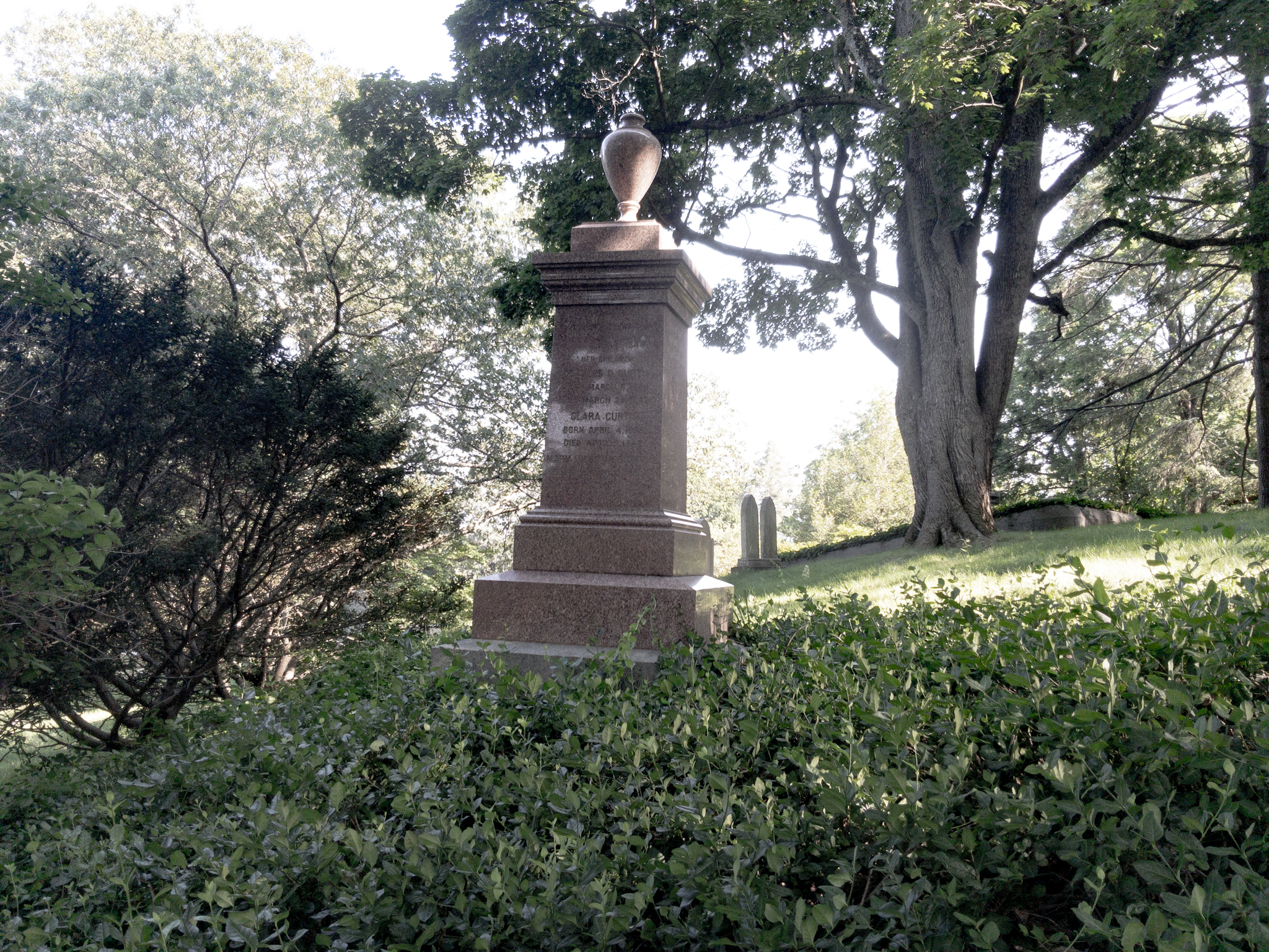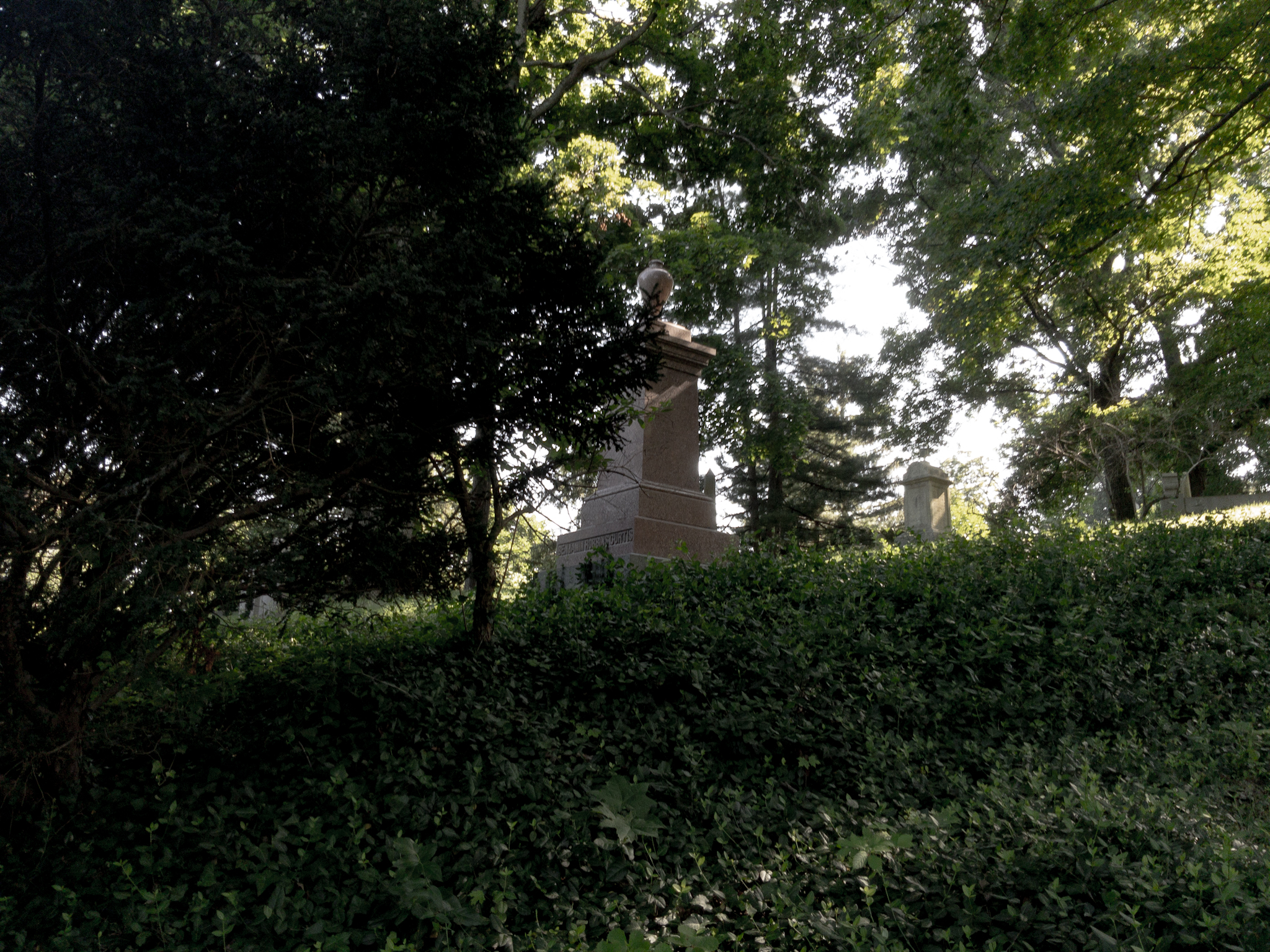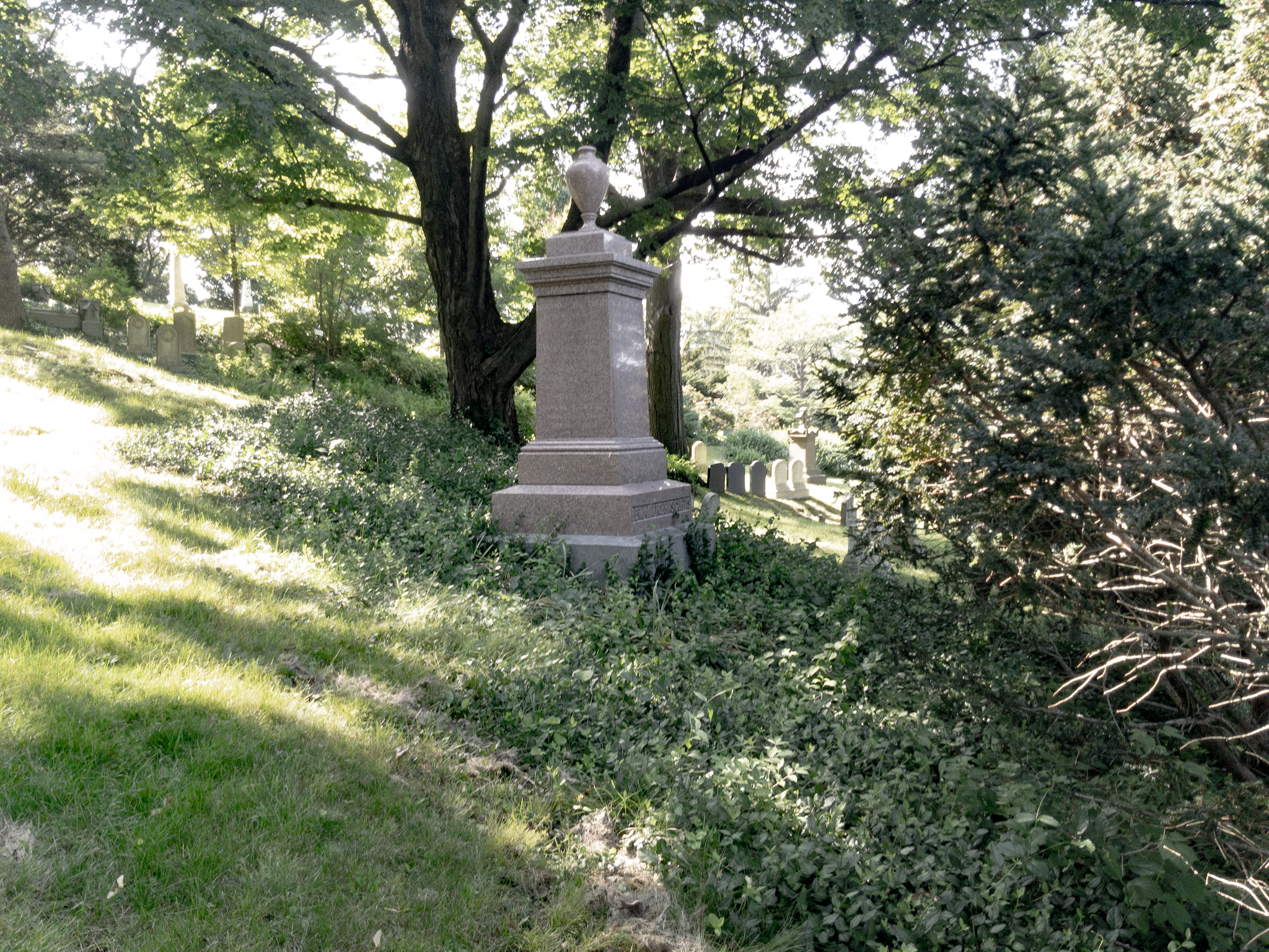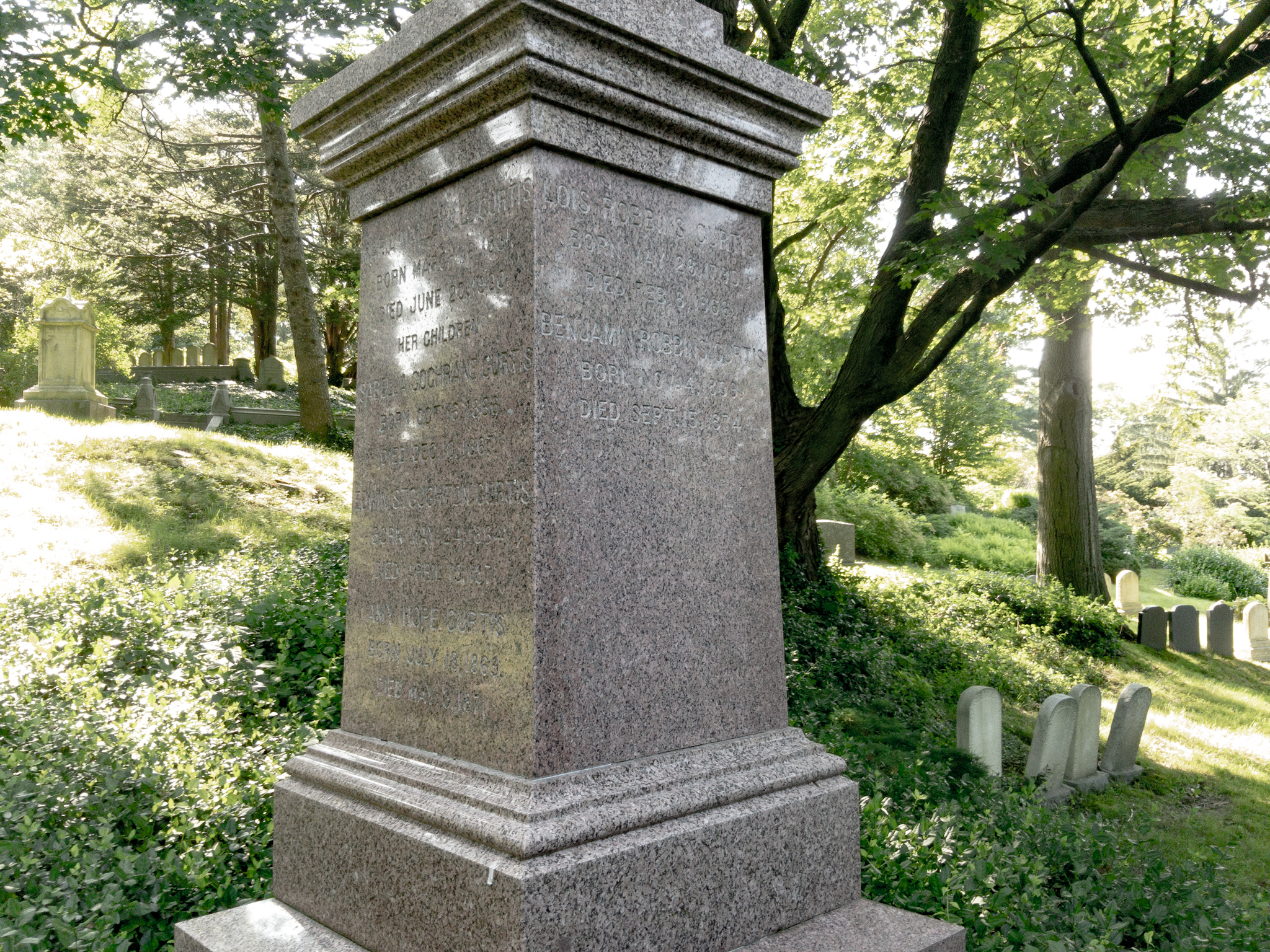 Get you a map from the main office at the entrance. The grave is on a terraced path called Olive Path on the eastern slope of the hill atop which sits Washington Tower, a major structure at Mount Auburn Cemetery. The front of Curtis's completely obscured by shrubbery, making it nearly impossible to spot. His grave is plot number 532, and following the numbers on the slope will be helpful in finding it.