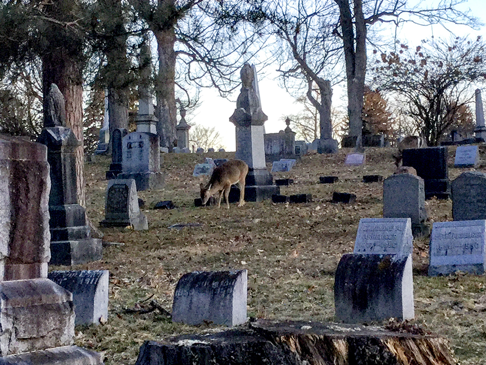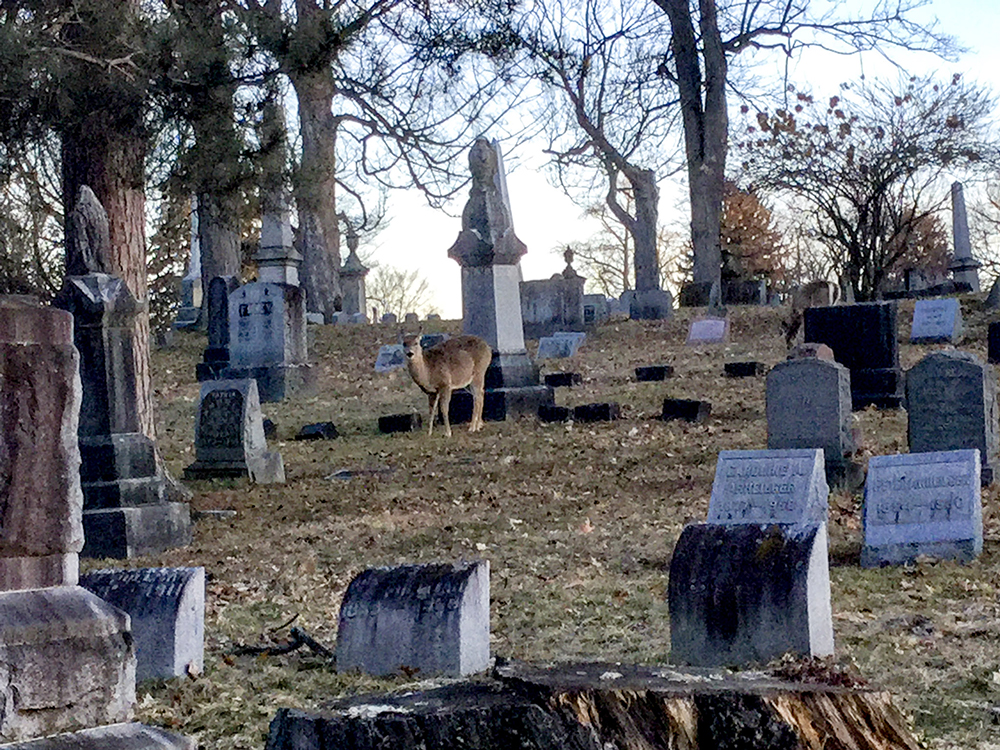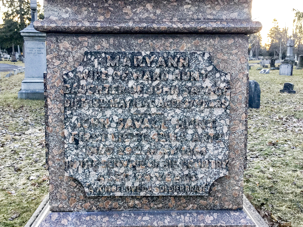 I had spent the night in an AirBNB in Rome NY. I checked out early and got on my way to Forest Hill Cemetery in Utica NY. It was still officially "dawn" when I arrived. There had been an overnight frost, and the grass was still covered. Also was visited by some deer on the way. Hunt's grave was not too difficult to find - he was right off the main cemetery road.