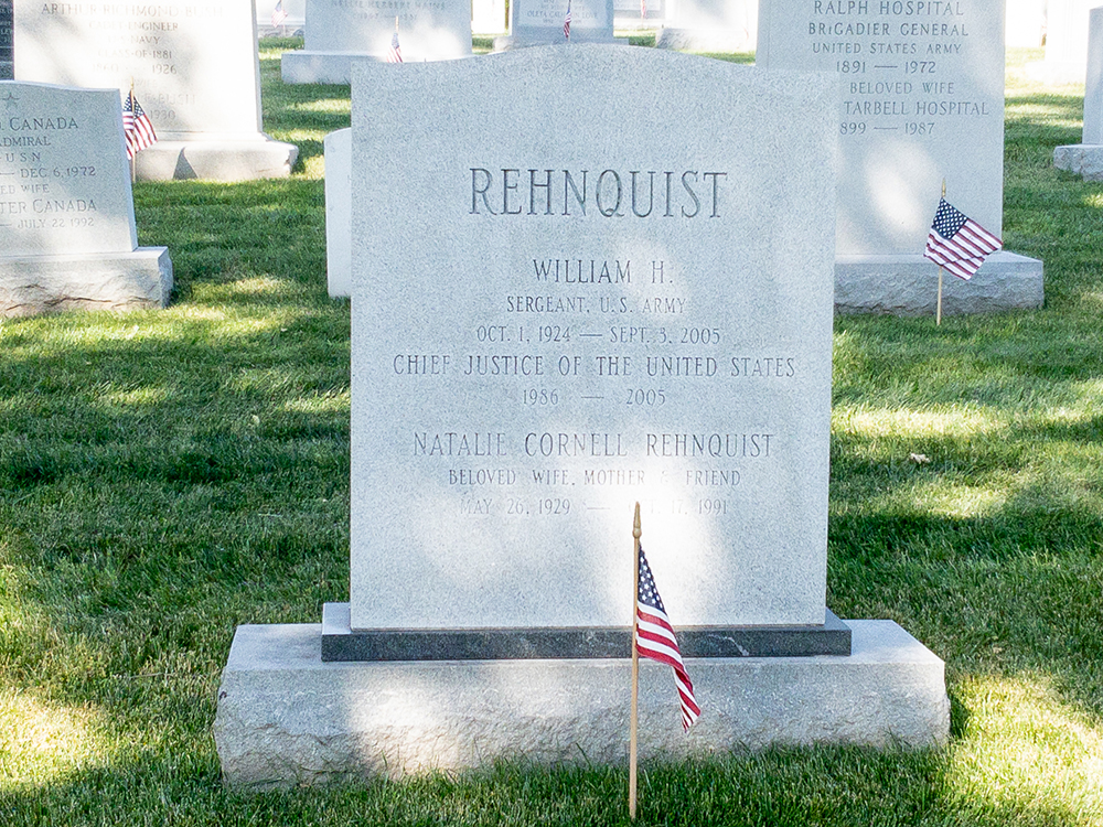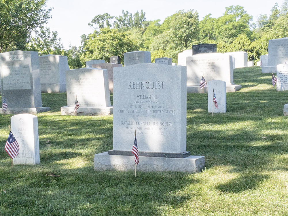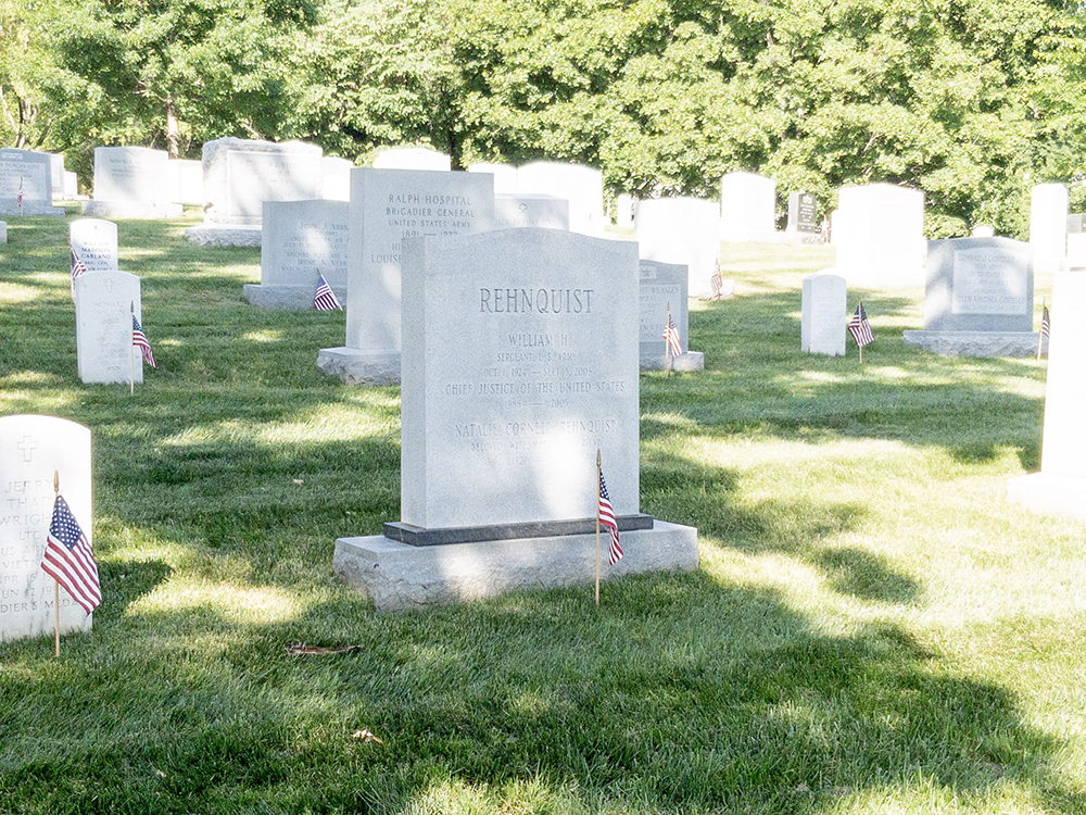 The graves of Ruth Bader Ginsburg, Warren Burger, Thurgood Marshall, Potter Stewart, John Paul Stevens, William Brennan, and Harry Blackmun are all located together in a spot very near the main entrance. Rehnquist is located a short pace further behind the main cluster of justices.