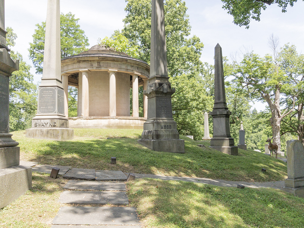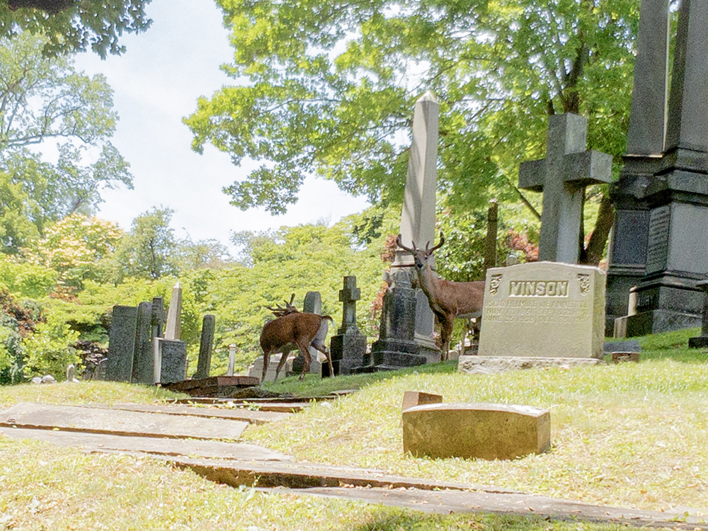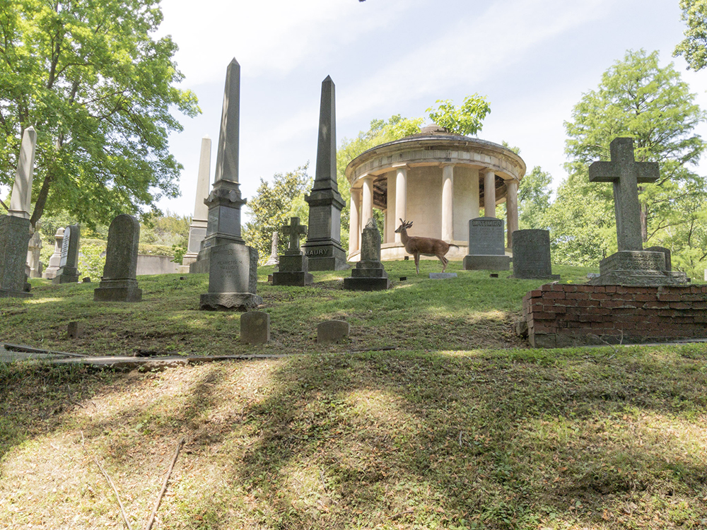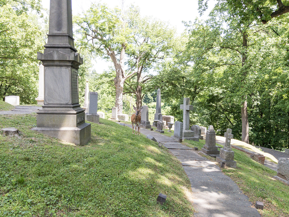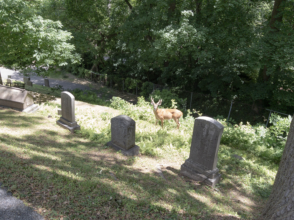 Swayne is located at the extreme east end of the cemetery on the east end of the ring around the rotunda. And when I got there, I found a bevy of deer. Handsome fellas too.